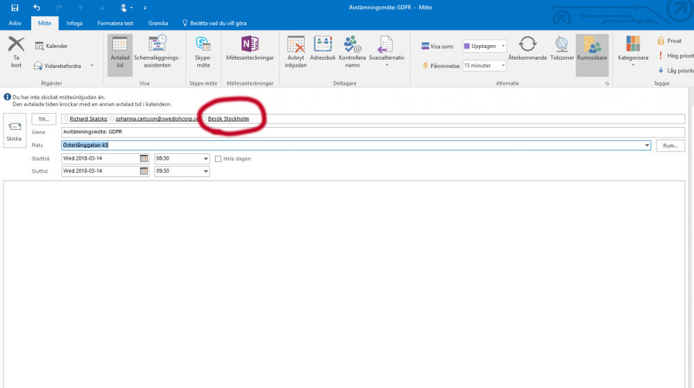 2. Lägg till deltagare och bokningsresurs i mottagarfältet