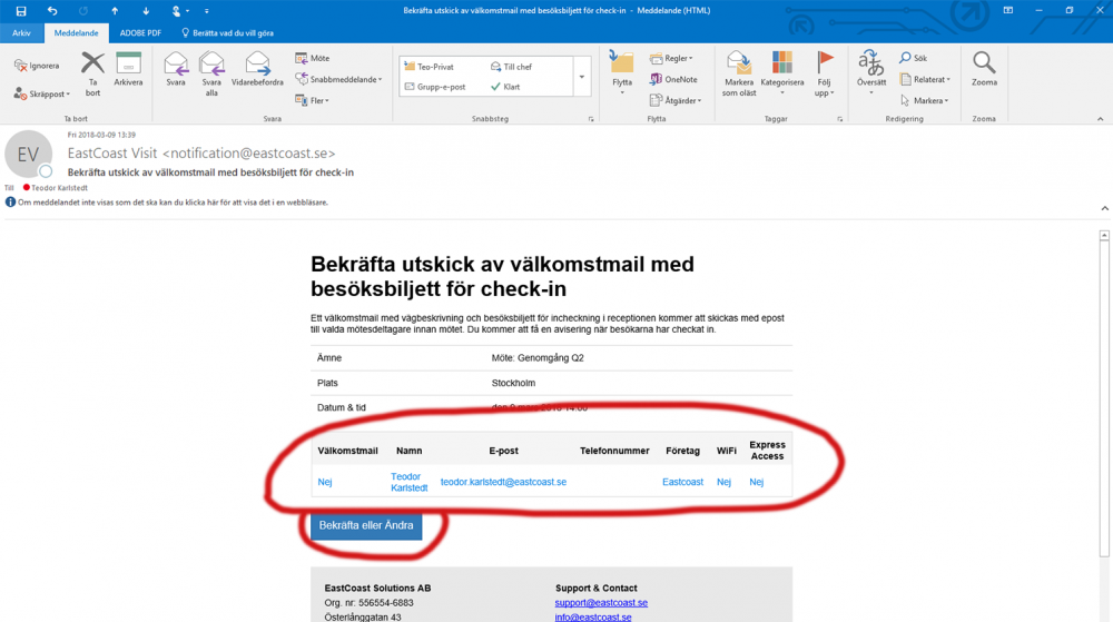 Strax efter att mötet bokats för du ett mejl där du har möjlighet att bekräfta eller ändra din bokning