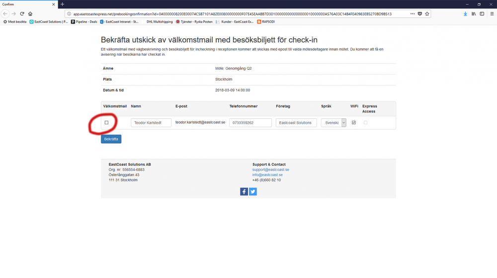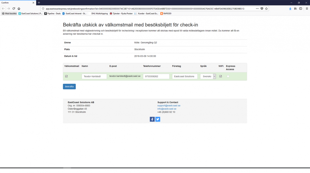 Bokningsresursen förbokar gästen i besökssystemet och skickar en inbjudan till gästen för enkel incheckning.