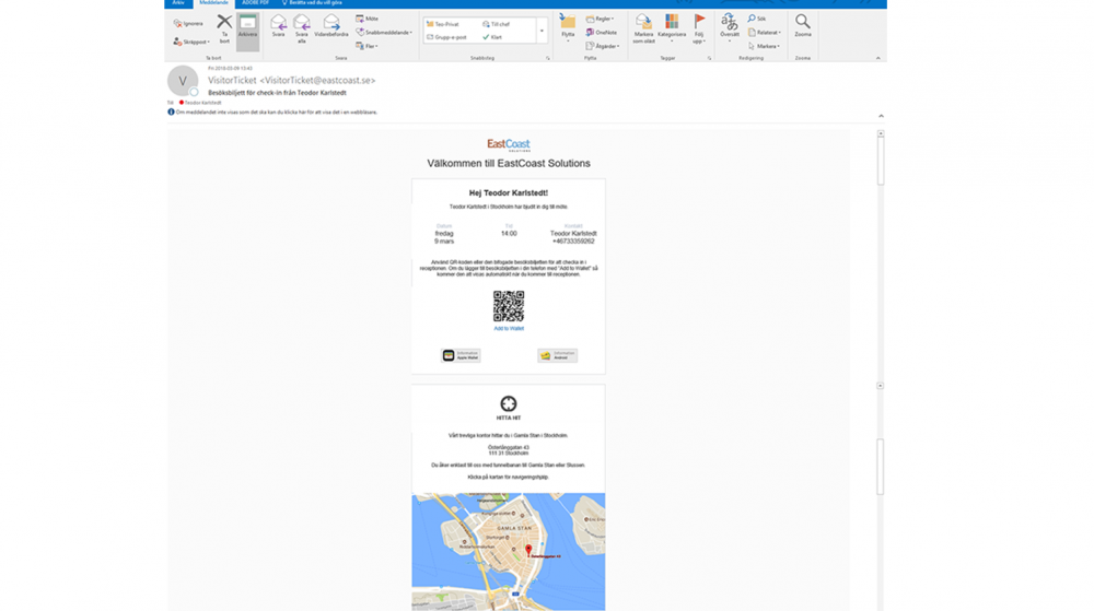 Dina besökare får ett snyggt, informativt välkomstbrev med mobil besöksbiljett via epost